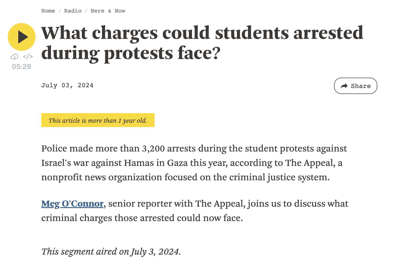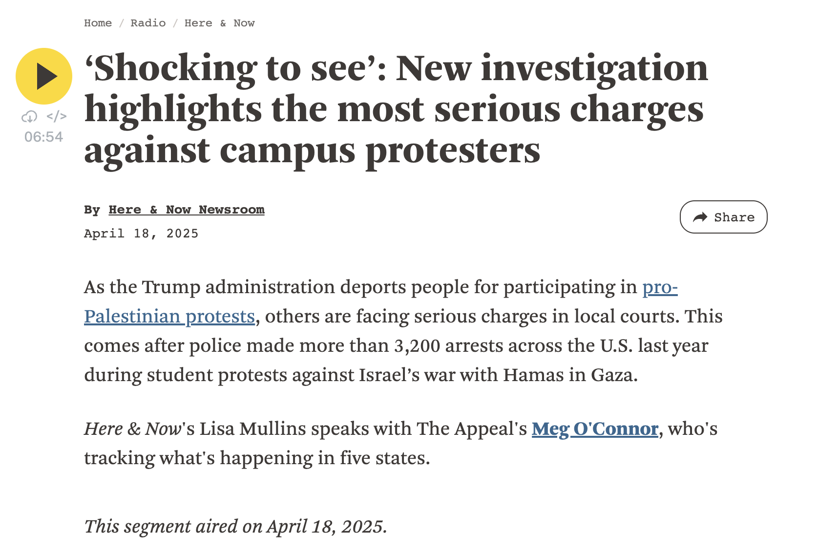 Appeared on NPR & WBUR to discuss a data project tracking arrests of campus protesters.