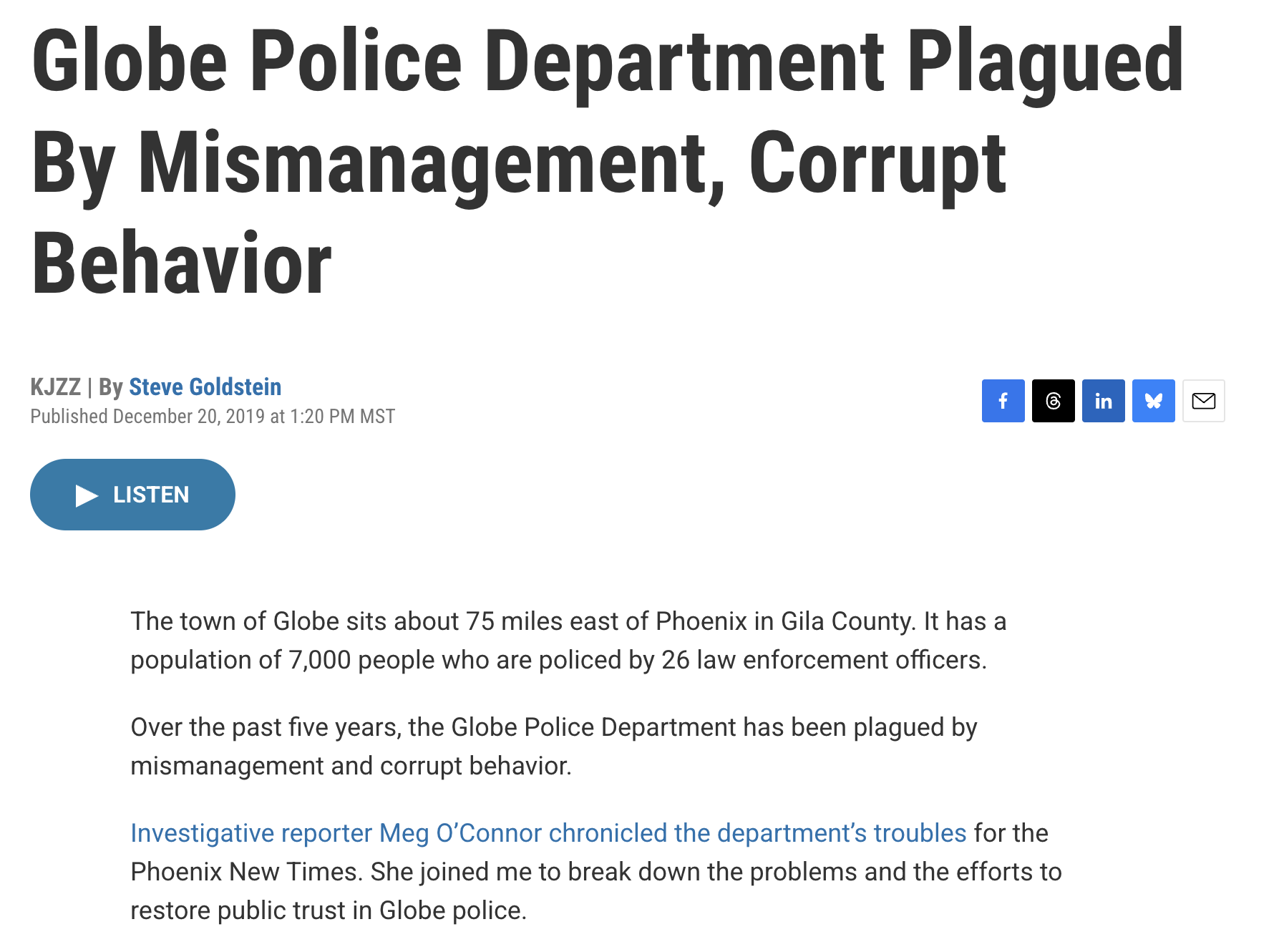 Appeared on The Show on KJZZ to discuss misconduct plaguing a tiny police department in Globe, Arizona.