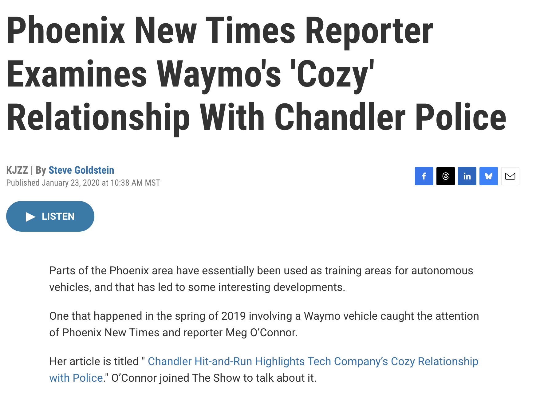 Appeared on The Show on KJZZ to discuss Waymo's relationship with local police departments in Phoenix, Arizona.